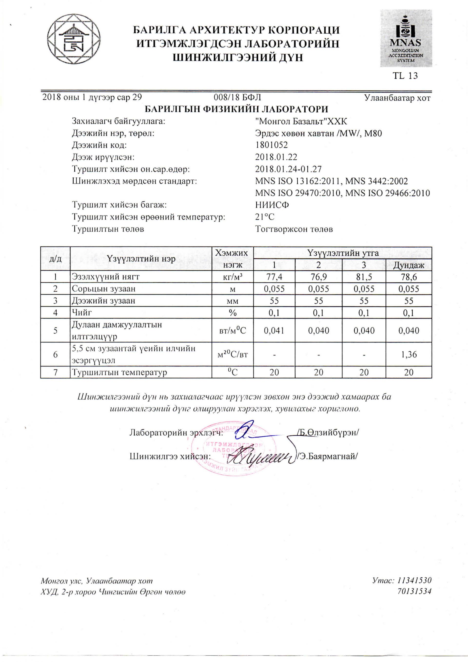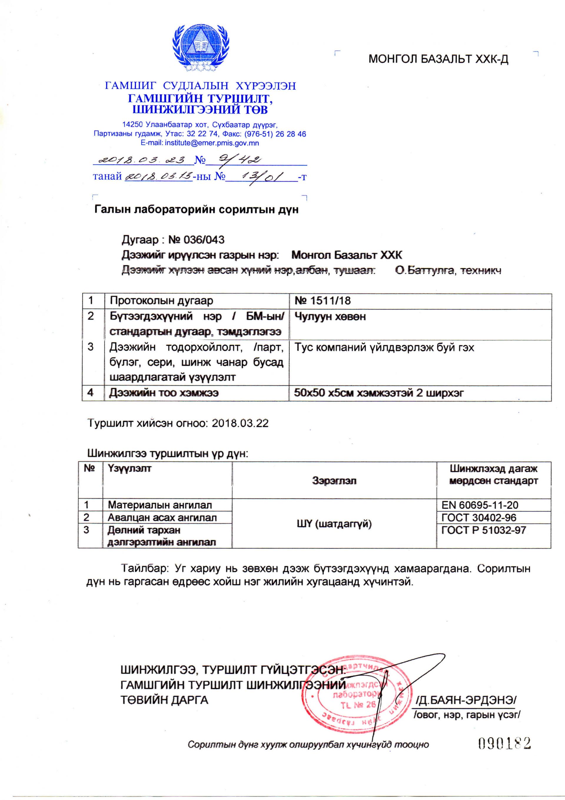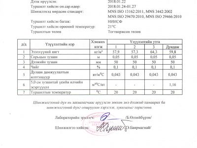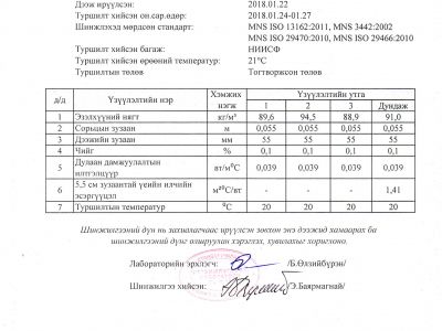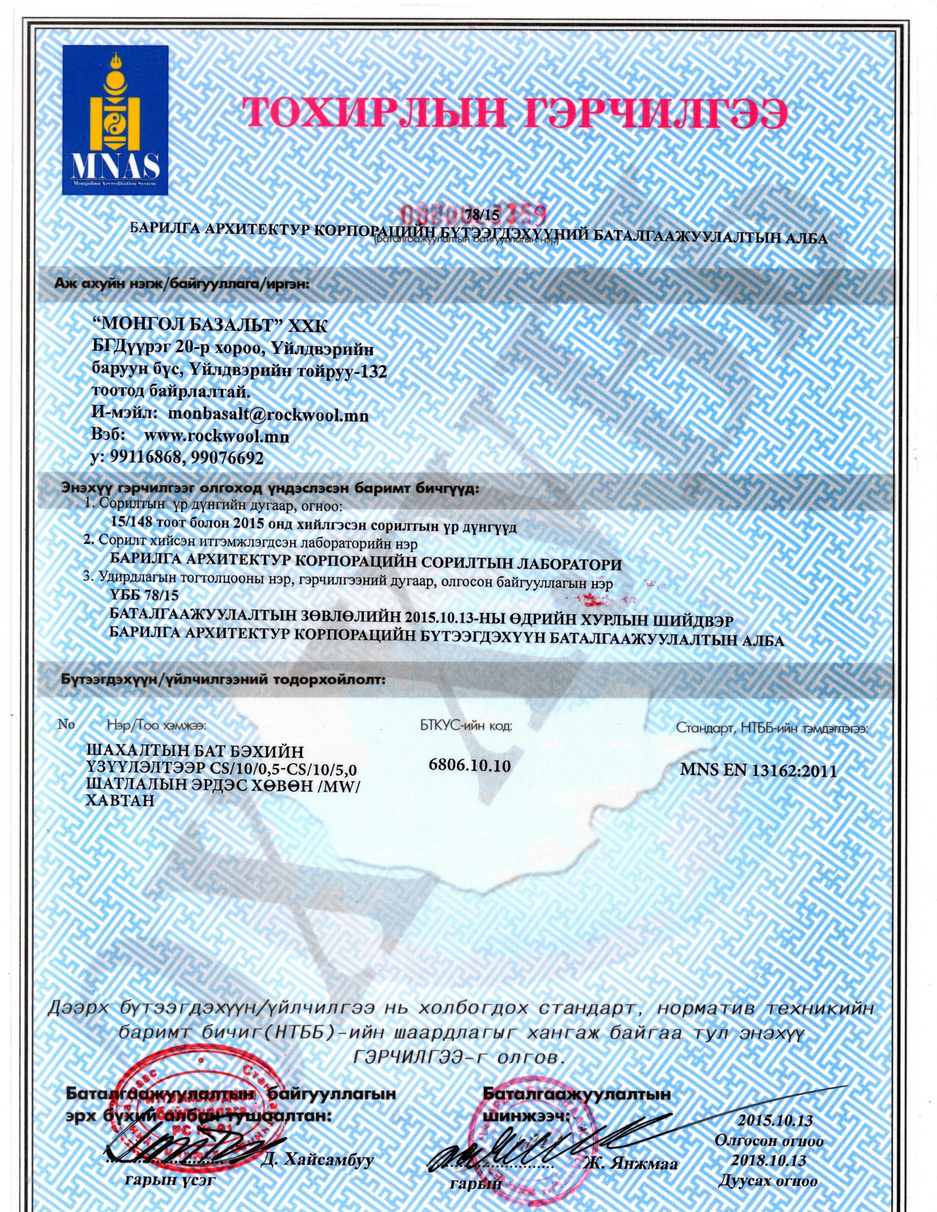Basaltwool брэндийн rockwool чулуун хөвөн бүтээгдэхүүнд олгосон тохирлын гэрчилгээ, лаборторийн шинжилгээний сэртифекатууд