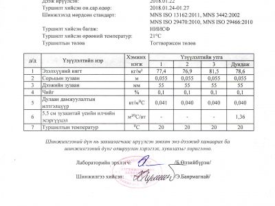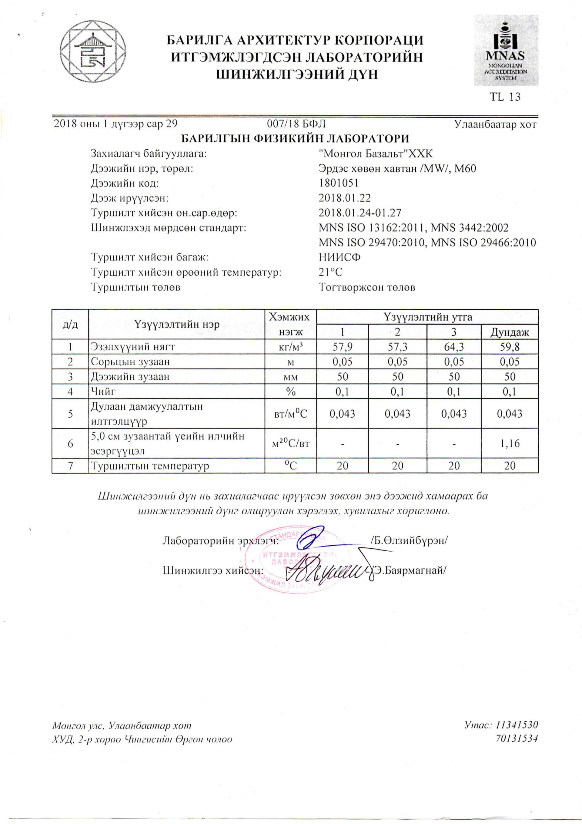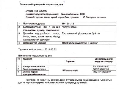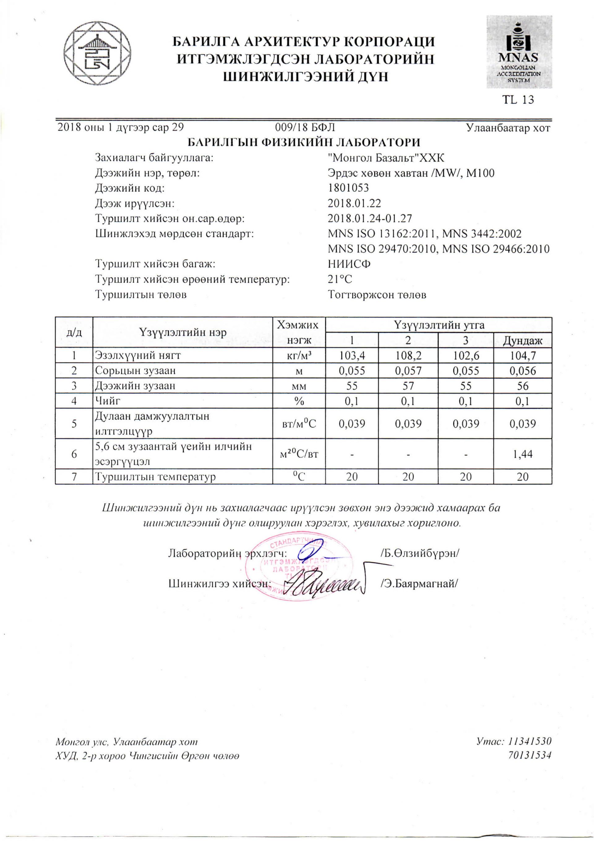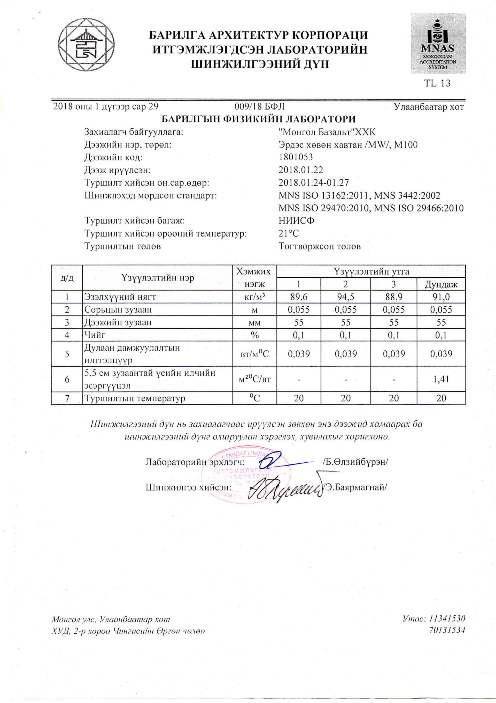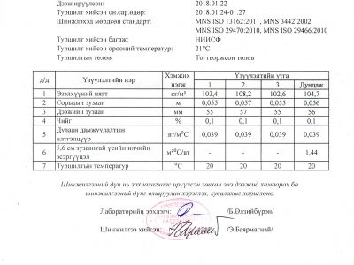 Basaltwool брэндийн rockwool чулуун хөвөн бүтээгдэхүүнд олгосон тохирлын гэрчилгээ, лаборторийн шинжилгээний сэртифекатууд